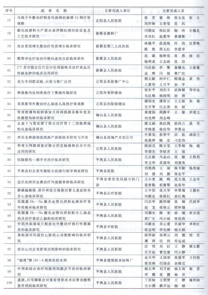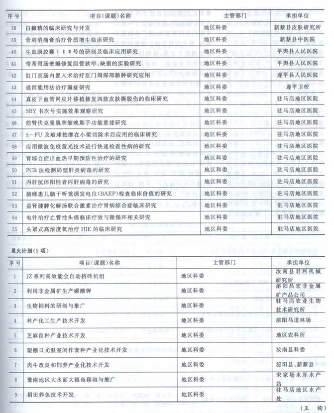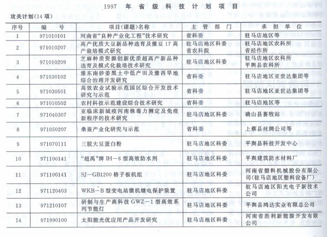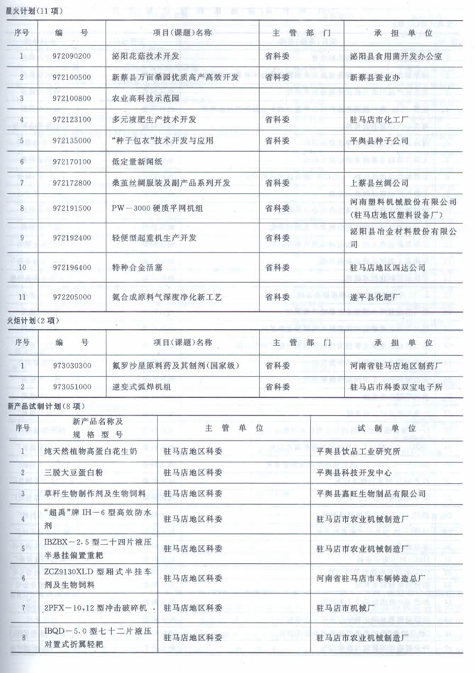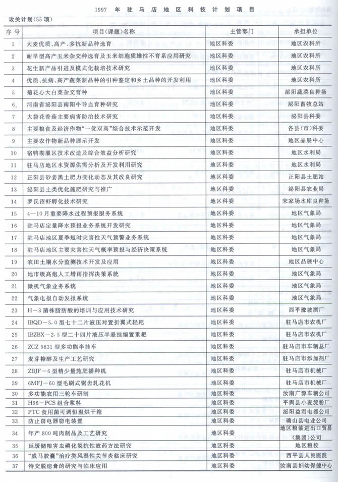 【重点科技计划项目实施】1997年,全区争取拨款和贷款6678万元,开发性项目年新增产值8.2亿元,利税1.2亿元,社会经济效益4.8亿元。重点实施的12项国家、省、地重大项目成效比较明显。国家级火炬项目“氟罗沙星原料及其制剂”争取国家科技开发贷款1500万元,项目建成后,可新增产值l.5亿元,新增利税2380万元。地区塑料设备厂承担的省级攻关项目“Pw—3000硬质平网机组”,技术水平先进,填补了国内空白。省级火炬计划项目“逆变式弧焊机”,由驻马店市双宝电子研究所承担,该产品完成后新增值2185万元,利税1140万元。在农作物新品种选育方面,先后育出芝麻、大麦、大豆、玉米、花生等17个有苗头的新品系,其中3个进行了省区试,芝麻新品系平芝9201在省区试中连续两年居第一位,玉米新品系驻单602在省区试中比对照增产17%。(王恂)