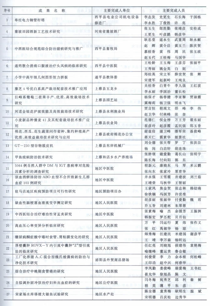 【实施“金桥工成”项目】 1997年,全区被省科协列入实施“金桥工程”项目的有10项。其中确山3项,上蔡3项,平舆2项,西平1项,地区1项。自1993年全区实施“金桥工程”项目以来,出现了一些成效显著的项目,在1997年省科协“五大”会议上。平舆县科协《甲鱼快速养殖及人工孵化》获省三等奖;上蔡县科协《抗虫棉引进开发》获省表彰奖;平舆县科协获省优秀组织单位三等奖;平舆县王全录获省优秀组织者奖;上蔡县科协《玉米笋系列开发》获省优秀科技建议二等奖。(徐翠英)