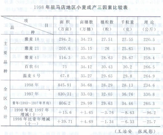 【主要小麦品种的表现】1997~1998年度小麦生育期间特殊的气象条件,是对区内夏粮生产水平的严峻考验,也是对小麦品种的大检阅,其品种表现可作为今后小麦品种利用的重要依据。