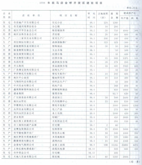 【1998年引进项目】截止1998年,开发区累计接触各类项目500个,参与洽谈2000人次,批准立项35个,其中工业性项目19个,经营项目11个,其它项目5个,项目协议总投资2.3亿元。(闫勇)