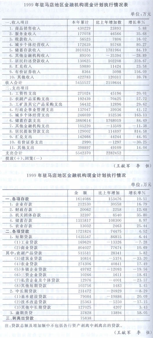 【信贷计划执行情况】 1999年,全区信贷计划情况良好,各项存款和各项贷款稳步适度增长。