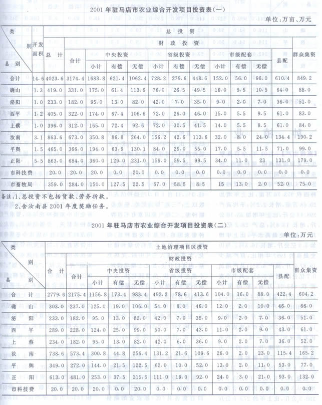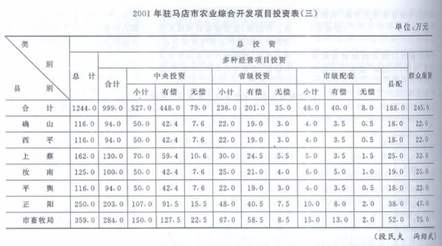 【扶贫开发慨况】 2001年,全市扶贫开发工作按照《中国农村扶贫开发纲要(2001~2010年)》的总体要求,以基率解决贫困人口的温饱问题为中心,以改善贫困人口的基本生活条件为重点,强化资金管理,加大督导力度,加强对口扶贫,狠抓科技推广,克服困难,务实苦干,较好地完成了全年扶贫工作任务。一是扶贫责任目标基本得到完成。全年基本解决25万贫困人口的温饱问题。其中新蔡县2.7万人,平舆县0.5万人,上蔡县2.5万人,确山县1.5万人,泌阳县8.1万人,正阳县2.5万人,汝南县2.9万人,遂平县4.3万人。二是贫困乡村基础设施建设进一步改善。2001年度,上级下达财政扶贫资金4474.5万元,重点用于基础设施建设,其中贫困乡村新修乡村公路97条281公里,学校84所,乡级医院门诊楼12座,新打机井787眼,修渠19.9公里,修桥64座,路涵16处,科技推广142项,修建广播电视台站9个、覆盖55个村。三是部分贫困乡、村的贫困状况得到缓解。四是贫困县、乡财政状况得到一定程度的好转。五是新组建一批扶贫龙头企业。如上蔡县的规模种植型、泌阳县的花菇产品深加工型,汝南县的规模养殖型企业,进一步增强了带贫能力。六是扶贫综合社会效益有进一步提高。贫困乡村文化、教育、卫生事业有了一定程度的改善。全年扶贫开发工作呈现如下特点。一、加强领导,层层落实责任制。一是实行党政一把手负总责制度。坚持把扶贫开发工作作为贫困县、乡经济建设的中心,层层分解任务,明确责任,一级抓级,层层抓落实。二是实行市四大班子领导包乡,县四大班子领导包村的领导干部扶贫包干责任制,形成上下联动、齐抓共管的扶贫工作格局。三是建立扶贫开发例会制度。四是狠抓农村基层组织建设。