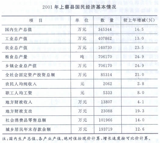 2001年,全县国内生产总值34.53亿元,比上年增长14.5%。其中,第一产业增加值13.02亿元,增长23.7%;第二产业增加值12.84亿元,增长11.9%;第三产业增加值8.67亿元,增长6.8%。国民经济和社会发展中存在的主要问题是经济结构仍不合理,就业压力大,农民收人增长缓慢,部分企业生产经营困难,物价仍未走出负增长。