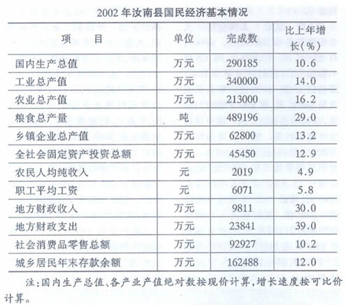 2002年,全县人民以邓小平理论和“三个代表”重要思想为指导,认真学习贯彻党的十六大精神,坚持以财源建设为中心,以发展特色经济为突破口,以结构调整为主线,面对加入WTO后的新形势,保稳定,促发展,不断强化农业基础地位,加快工业发展,扩大对外开放,发展第三产业,培育和发展新的经济增长点。国民经济继续保持良好发展态势,实现了较高的增长速度,城乡居民生活水平继续提高,各项社会事业进一步发展。全年国民生产总值29.02亿元,比上年增长10.6%。其中,第一产业增加值增长15.5%;第二产业增加值增长4.6%;第三产业增加值增长11.3%。三次产业结构调整为41.6:33.2:25.2。