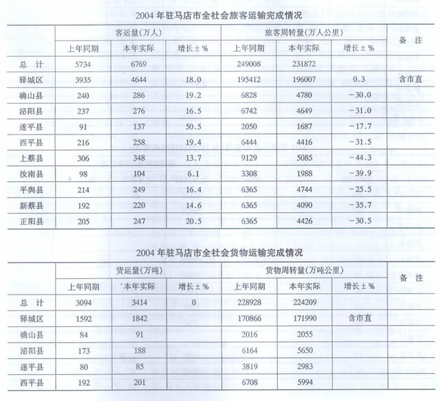 【公路运输】 全市完成客运量6769万人,客运周转量231872万人公里;货运量3414万吨货运周转量224209万吨公里;完成运管费1852万元,完成年计划的123%;客票附加费1289万元,完成年计划的94%;货运附加费1115万元,完成年计划的97%。围绕年度目标主要做了以下几个方面的工作:
