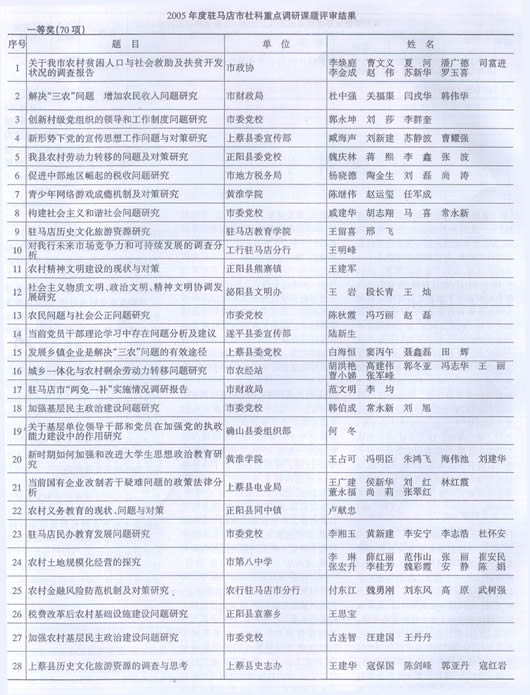 【社科优秀成果评奖和社科重点调研课题评审】 2005年一是承办了第12次市社科优秀成果评奖工作。经评奖委员会专家的评选,有105项成果获奖,其中一等奖27项,二等奖67项,三等奖11项。评奖工作突出了3个特点,在评选内容上,突出了“三个代表”重要思想、党的十六届四中全会精神、科学发展观、构建和谐社会、先进性建设和市委工作会议等方面的学习调研成果;在评选重点上,突出了全市经济社会发展重大现实问题的应用性研究成果,尤其是“三项建设”、“三化”建设、“三农”问题、县域经济和驻马店平安崛起等对策性研究成果;在评选领域上,突出向基层拓展延伸,鼓励基层社科工作者积极参与社科研究,进一步扩大评奖的覆盖面和影响力。二是完成了2005年度市社科重点调研课题的立项、评审工作,127项立项课题大部分已经完成,经市社科调研课题评审委员会鉴定和评审,认定104项调研成果达到了结项要求,并评出一等奖70项、二等奖34项。从结项的调研成果看,整体质量有较大提高,不少调研成果成为领导决策和指导工作的重要依据。据统计,2005年全市社科工作者共出版著作60余部,在各级报刊杂志和学术会议上发表理论文章1500多篇。(刘洪)