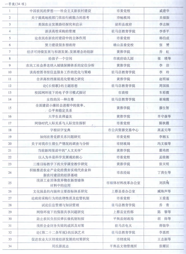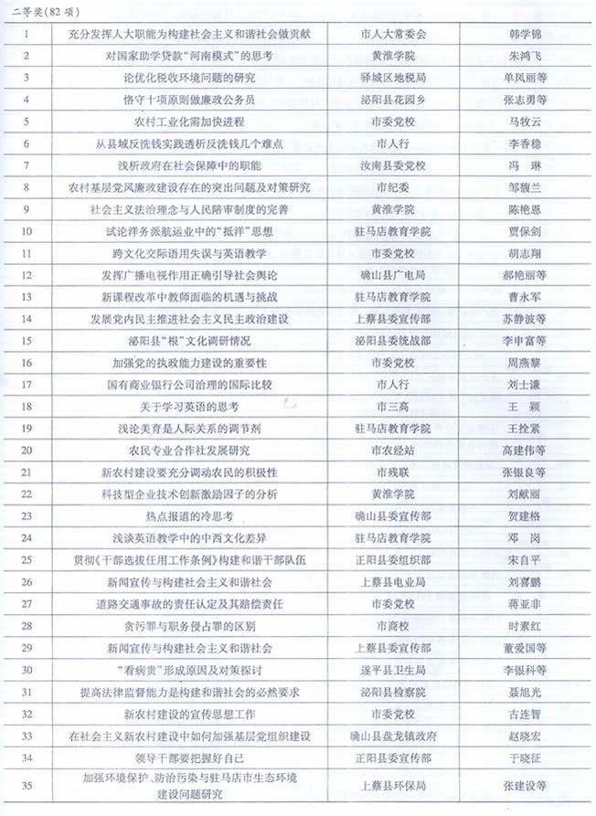 【“天中交警风采杯”大型调研活动】2008年11月,驻马店市社科联联合市委政法委、市法学会开展驻马店市涉法涉诉信访问题与构建和谐社会“天中交警风采杯”大型调研活动。本次调研广泛邀请法律专家、社会法学工作者以及一线政法干警参与,针对当前“涉法涉诉信访问题”的特点、成因以及相应对策进行广泛深入地调查研究。此次调研活动取得了丰硕的理论研究成果,共撰写理论调研文章68篇,经过评委认真评选,评出一等奖3篇,二等奖5篇,三等奖7篇,这些调研成果极大地促进了全市有关涉法涉诉信访问题理论研究的健康发展,为今后处理相关问题提供了有力的理论支持。(李华勇)