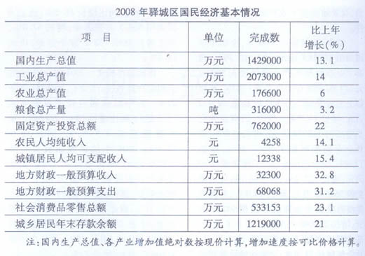 2008年,驿城区国民经济快速增长。全区生产总值142.9亿元,增长13.1%。其中,第一产业增加值10.1亿元,增长6%;第二产业增加值76.9亿元,增长12.8%;第三产业增加值55.9亿元,增长14.8%。产业结构由上年的8.4:53.8:37.8变化为7.1:53.8:39.1,经济结构调整取得新进展。市场物价稳中有升。全年居民消费价格总水平为106.1,比上年上升6.1%。其中食品价格上升17.4%,医疗保健及个人用品价格上升2.1%,家庭设备用品价格上升3.6%,居住价格上升3.7%,商品零售价格总水平上升6.9%。?