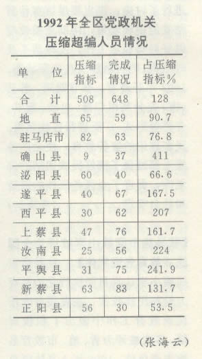 【压缩党政机关超编人员】根据省委、省政府豫发[1991]41号文件关于各地、各部门要切实做好机关超编的“消肿”工作的精神,年初,地区编委按压缩超编人数15%的比例,向全区分解下达了508名压缩指标。截止10月底统计,全区共压缩机关超编人员648名,较好地完成了任务。(张海云)