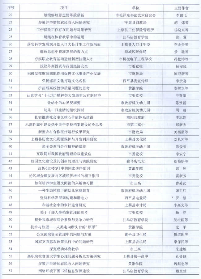 【社科优秀成果评奖和理论征文评选】2009年,市社科联组织承办了全市第16次社科优秀成果评奖工作。经过个人申报、单位审验、评委集体定评,共有168项社会科学优秀成果获奖。与市委宣传部等单位联合举办纪念新中国成立60周年理论研讨会论文征集活动,共征集《天中潮——驻马店市60年发展历程回顾》等理论文章75篇,经过专家评委认真细致评选,共评出特等奖2项,一等奖28项,二等奖25项,三等奖17项,在此基础上,编写出《纪念新中国成立60周年理论征文选编》。(李华勇)