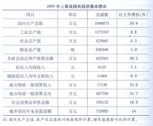 2009年,全县国民经济保持平稳较快发展。全县全年生产总值1048875万元,比上年增长10.4%。其中,第一产业增加值242876万元,增长4.3%;第二产业增加值425222万元,增长10.7%;第三产业增加值380777万元,增长14.9%。人均国内生产总值为8193元。全年居民消费价格总水平比上年增长0.21%。食品价格有升有降,上升幅度较大的是鲜菜类,比上年同期上升32.8%,下降幅度最大的是食用植物油,比上年同期下降26.5%。农业生产资料价格总水平上升1.5%。商品零售价格总水平上升1.1%。?