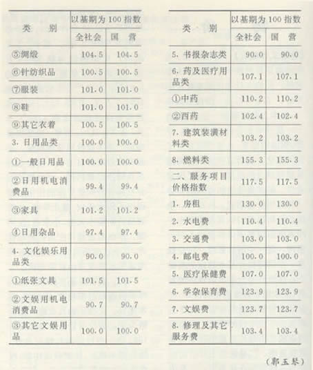 三、价格水平。1992年,全区各类商品零售物价和职工生活费用价格指数除文化娱乐用品类和书报杂志类比去年略有下降外,均呈上涨趋势。(郭玉琴)