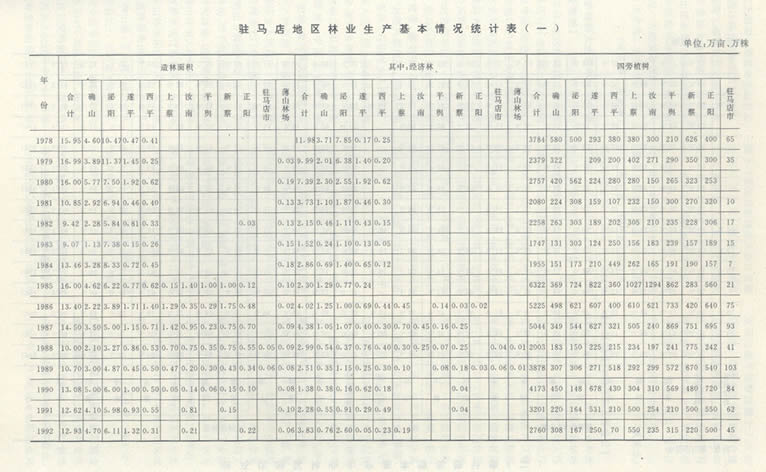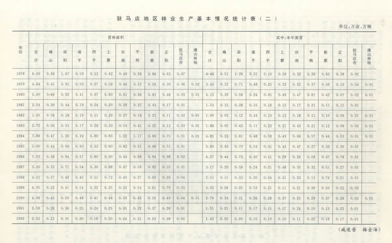 【林业工作概述】党的十一届三中全会以来.驻马店地区林业生产认真贯彻落实党和国家的林业方针、政策,以“发展资源、保护资源”为宗旨.广泛宣传发动群众,大力开展植树造林,取得了可喜的成绩。至1992年底,全区成片造林面积达到160万亩,四旁植树保存1.7亿株;木材蓄积量增加到700万立方米,林木覆盖章达到14%。“全国平原绿化座谈会”、“全国新型炭林现场会”、“河南省平原绿化现场会”、“河南省国乡合作林场现场会”先后在本区召开,1991年荣获“全国平原绿化先进单位”奖牌,1991年、1992年连续两次获省林业厅颁发的“造林质量先进单位”锦旗和奖杯。l992年在邓小平南巡重要谈话和的“十四”大精抻指引下,全区林业部门坚持用改革统揽林业工作全局,大搞植树造林,圆满完成了各项林业生产任务,据统计,全年共完成成片造林13.9万亩,占年度计划12.5万亩的111.2%.其中经济林4.0万亩;四旁植树3201万株,占年度计划1500万株的213.4%,林业育苗2.25万亩.占年度计划2.0万亩的ll2.5%;封山育林6.0万亩,占年度计划的100%,林业系统共创办经济实体和经营项目70多个,刨产值150多万元,实现税利40多万元。主要做法是: