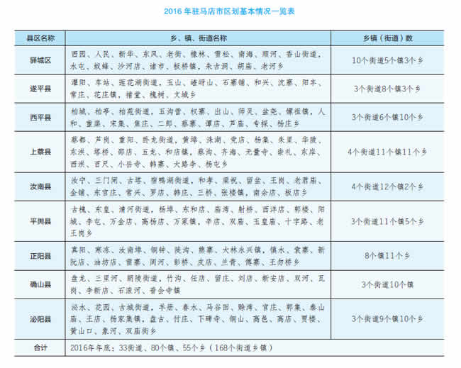 2016 年年底,驻马店市辖8 个县,1 个区,168 个乡、镇、街道,其中55 个建制乡,80 个建制镇,33 个街道。(李方伟 张佳佳)