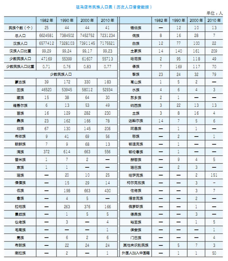 2015 年,全市有 44 个民族(含未识别民族及外国人加入中国籍),其中少数民族 41 个,总人口 74517 人(不含新蔡),居全省第五位,其中回族人口 70198 人占 97%。按人口数量依次为回、壮、满、苗、佤、土家、蒙古、拉祜、傣、彝、侗、布依、黎、白、瑶、哈尼、藏、朝鲜、布朗、傈僳、仡佬、纳西、赫哲、维吾尔、畲、景颇、京、羌、水、仫佬、土、毛南、塔塔尔、阿昌、塔吉克、哈萨克、德昂、普米、怒、高山、鄂伦春。少数民族人口超过万人的县区有西平县、平舆县、驿城区,全市有西平县蔡寨回族乡 1 个民族乡镇,少数民族人口千人以上的乡镇 30 个,少数民族聚居村 68 个。民族分布状况为:西平县 31 个,上蔡县 30 个,平舆县 29 个,遂平县 28 个,汉南县、正阳县、确山县 24 个,泌阳县 14 个,开发区 5 个,驿城区 3 个。