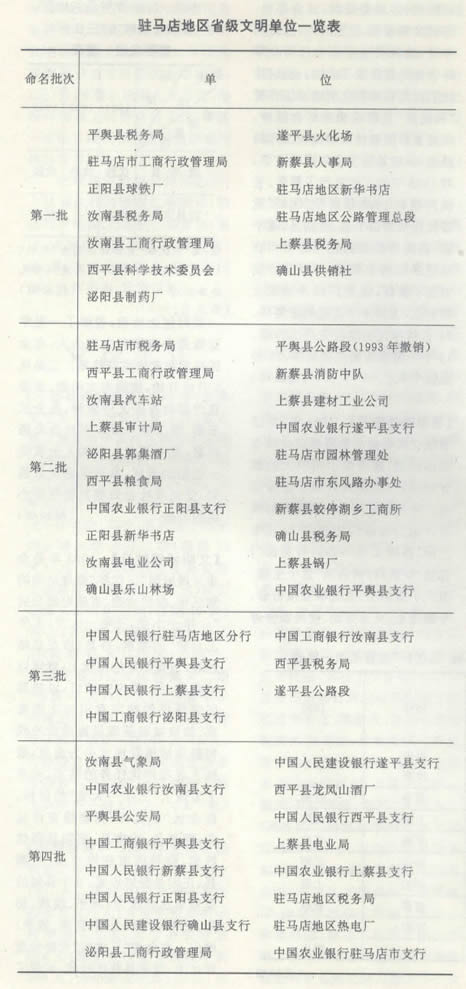 【精神文明建设活动概述】 全区群众性精神文明建设活动始于1980年开展的青少年共产主义道德教育工作。1980年5月地区成立了“青少年共产主义道德教育领导小组”,1983年12月又根据活动内容更命为“驻马店地区‘五讲四美三热爱’活动领导小组”,1987年4月正式定名为“驻马店地区文明单位建设指导委员会”(简称文明委),下设办公室(简称文明办)。各县、市也都成立有相应的组织。文明办作为党委、政府主抓精神文明建设的办事机构,在精神文明建设中行使综合、协调、指导、监督的职能,主要工作任务:一是开展旨在以提高人的素质、培养“四有”新人为目的的各种思想道德教育活动。二是开展文明单位建设和各类共建精神文明活动。以创建活动为载体,把培育“四有”新人的任务落到实处,优化社会细胞,并以开展创建活动为手段促进单位各项工作。止1993年底,全区共建成各级文明单位3489个,其中省级55个,地级566个,建成地级文明系统12个,省级文明村10个,地级文明村195个,地区表彰的各类共建先进集体51个。三是开展“三优”(优美环境,优良秩序、优质服务)文明城镇建设活动。按照省委、省政府的要求,从1991年开始在全区开展城镇“三优杯”竞赛活动,使全区城镇“脏、乱、差”现象得到较为有效的治理,在优化改革开放和经济建设环境方面发挥了积极作用。 (杨松田)