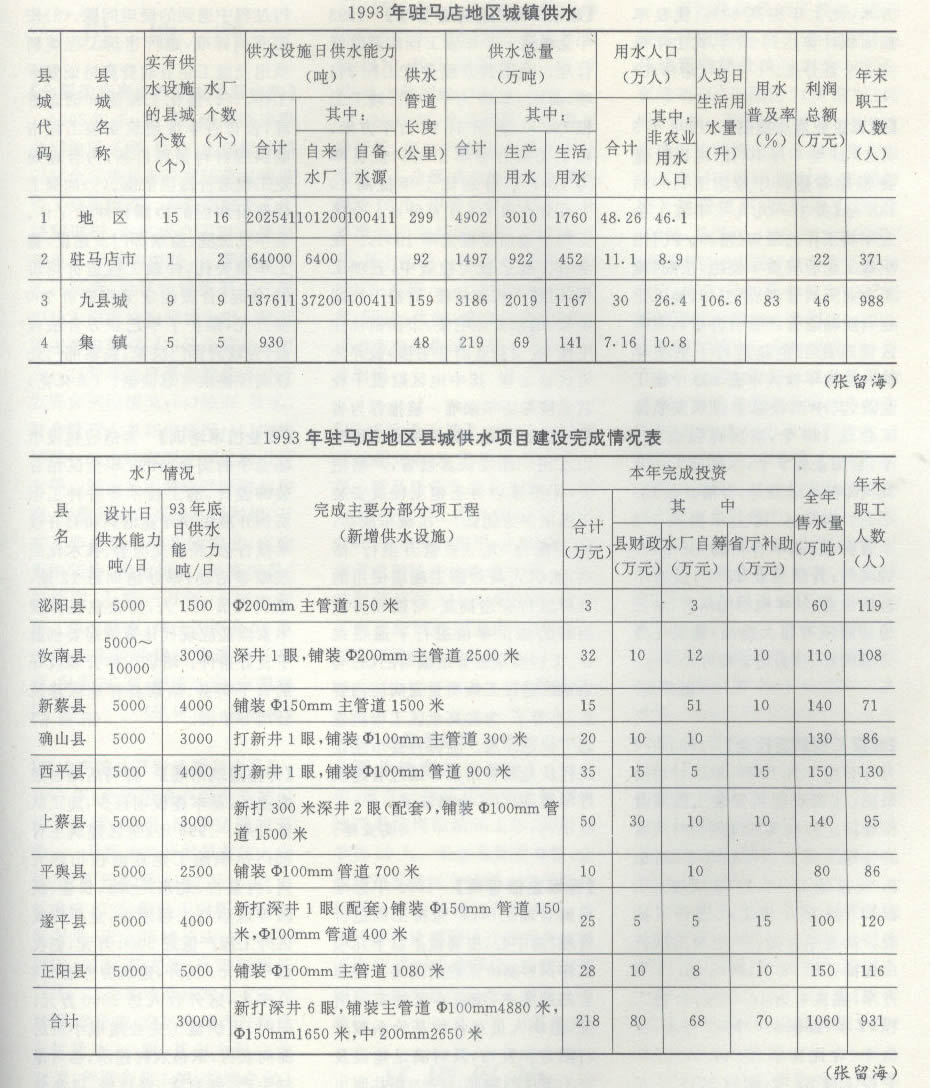 【城镇供水】 1993年底,全区有自来水厂11个(驻马店市水厂和王楼净水厂两个;其他县城各1个),输水管长度251公里,城镇用水普及率89%。全年九县完成供水设施建设投资218万元,其中财政投资80万元,省厅补助70万元,新打机井6眼。铺装直径100毫米的管道4880米,直径150毫米的1650米,直径200毫米的2650米,新增供水能力4950吨/日。驻马店市投资3400万元,完成板桥水库至驻马店市供水工程一期工程,形成3万吨/日供水能力,1993年7月1日正式供水。全市供水总能力达到9万吨/日。正阳县自来水公司于1993年率先对本公司试行股份合作制改造,吸收股金24万元,正式成立正阳县“三源”股份有限公司,这在全省目前尚属首家。