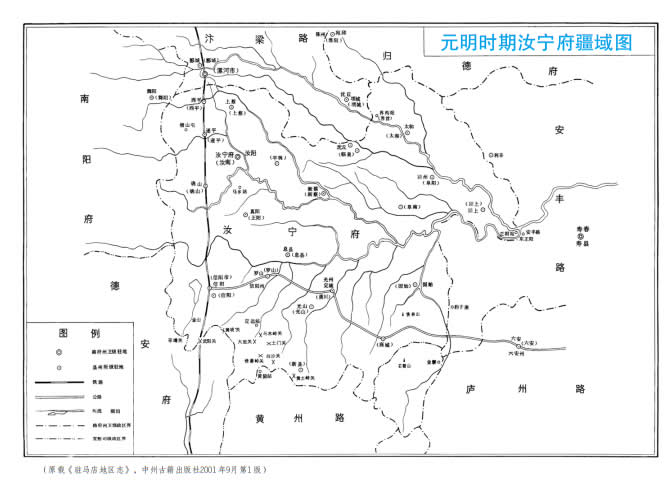 【元明清】元代(1271—1368),政区分省、府、州、县四级。至元三十年(1293),升蔡州为汝宁府(治汝阳县,今汝南县)。元时境内为汝宁府和南阳府(治今南阳市)所辖,隶河南行中书省。汝宁府领 14州县,境内有 1州即息州(治今息县)7县:汝阳县(今汝南县)、新蔡县(今新蔡县)、上蔡县(今上蔡县)、遂平县(今遂平县)、西平县(今西平县)、确山县(今确山县)和真阳县(今正阳县);南阳府领 5州 13县,境内有唐州(治今唐河县)泌阳县。