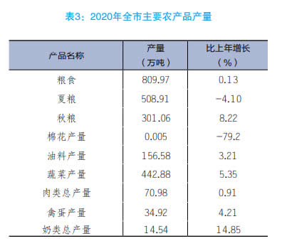 全年粮食产量 809.97万吨,比上年增长 0.13%。其中,夏粮 508.91万吨,下降4.1%;秋粮 301.06万吨,增长8.22%。油料产量 156.58万吨,增长3.2%。棉花产量 0.005万吨,下降79.2%。