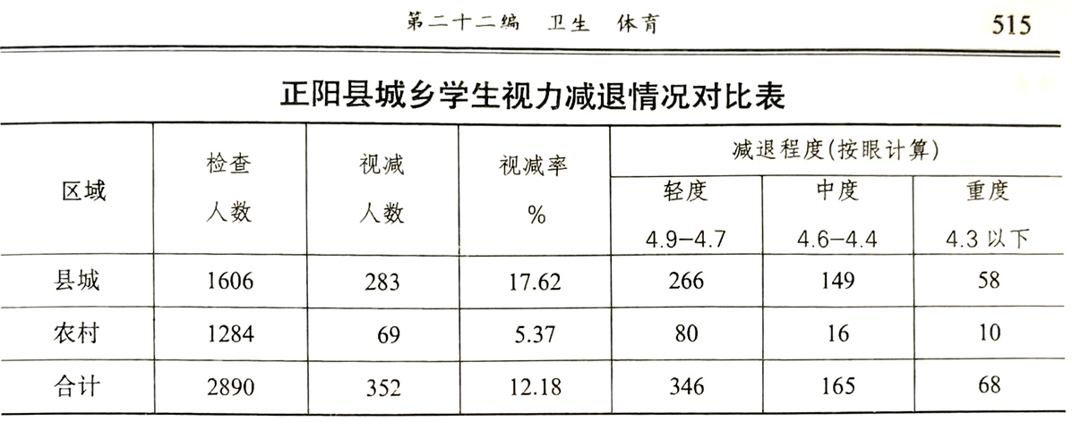1980年3月、1981年10月和11月,进行了3次学校卫生检查,重点解决了住校学生的寝室防潮、防寒、防虫问题。1981年11月,对正阳一高、二高、一中、一小、三小和油坊店完中、铜钟完中7所学校学生进行了身长、体重、胸围、呼吸差、血压、血红蛋白质生长发育情况及视力、辨色力、砂眼等患病情况进行调查。初步掌握了在校学生的生长发育水平及影响学生健康的主要因素。调查结果表明,学生视力减退是当时较为普遍的严重问题。通过分析,查明了学生视力减退的主要原因,为预防学生视力减退提供了依据。
