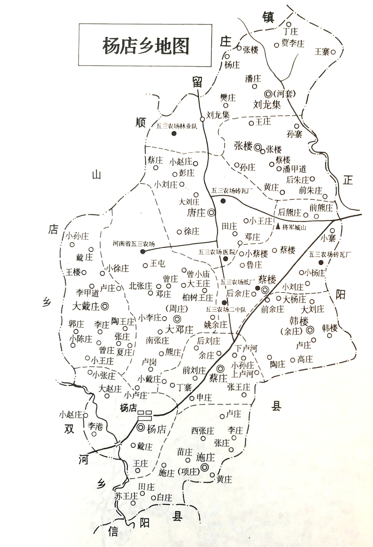 杨店乡大邓庄行政村北部设有河南省五三农场场部,唐庄、蔡楼两行政村境内有五三农场纸厂、砖瓦厂、医院等单位。