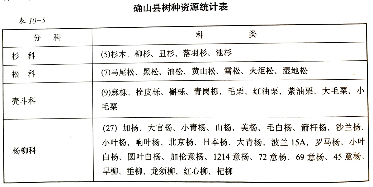 1965年起,从外地引进的树种还有湿地松、火炬松、雪松、马尾松、喜树、油橄榄、枫树、香柏、五针松、翠兰柏、花柏、龙柏、地柏、洒金柏、苏铁、重阳木、桉树、棕榈等稀有树种。同时还引进有豫北的山楂,淮南的茶叶等经济林种。这些树种在确山定植后,生长良好,并有一定效益。