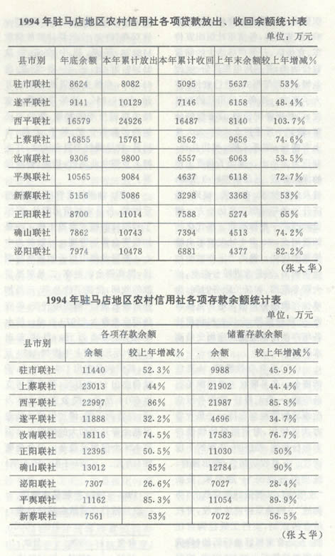 【农村金融概况】 1994年,中国农业银行驻马店分行和农村信用社进一步转换经营机制,调整经营策略,拓宽业务领域,使全区农村金融各项工作都取得了显著成绩。止年底,全区农行、信用社各项存款余额达32.3亿元(农行17.9亿元),比上年增长一倍以上,其中,农村储蓄存款余额11.6亿元,较上年增长1.13倍;各项贷款余额24.5亿元(农行14.4亿元),利息收回率达到93.98%,较年初提高2.4个百分点。全区农行在出色地完成各项支农任务的同时,实现减少政策性亏损1690万元,是近3年来效益最好的一年。