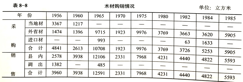 木材 1956-1957年,木材公司组织3个流动收购组在县境山区、农村收购木材,并委托出山、仪封、权寨、二郎、合水、五沟营6个基层供销社代购。1957年后,在出山、仪封、合水、权寨、城郊、二郎各设木材收购点,至1960年共收购当地木材1.76万立方米,购东北木材3402立方米。外地木材因价高销售迟缓。1958年由于大量伐林烧炭炼铁,1960年后当地木材收购困难,靠国家计划调拨,由东北、湖南、广东、云南等地调入。1964年从外地购进木材1.23万立方米,为历史最高年份。1955-1985年,总计收购当地木材1.76万立方米,购外省13.77万立方米,进口3411立方米。