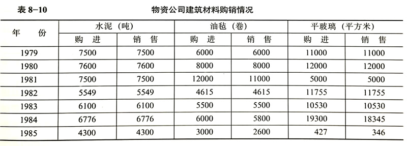 其他 物资公司初建时,主要经营石灰、沙石、砖瓦、苫草等。年购销额万元左右。1964年开始经营水泥、油毡、沥青、机制砖瓦、石棉瓦、平面玻璃等。其货源是国家指令性计划调拨和生产,经营部门协作调剂。计划内价拨一般占总购进额的15%,重点用于水利、桥涵、工业、交通等重点项目的兴建、扩建和改造。1978年以后,城乡普遍兴建、更新房舍,建筑材料供应不能满足需求,公司设法广泛采购计划外材料。1984年销售水泥近7000吨,比1964年增长60多倍;销售平面玻璃近200标准箱,油毡近6000卷。1985年,建筑公司、水利局、制杆厂、个体商户等多家经销水泥、油毡、平面玻璃等建筑材料,物资公司销售量减少。