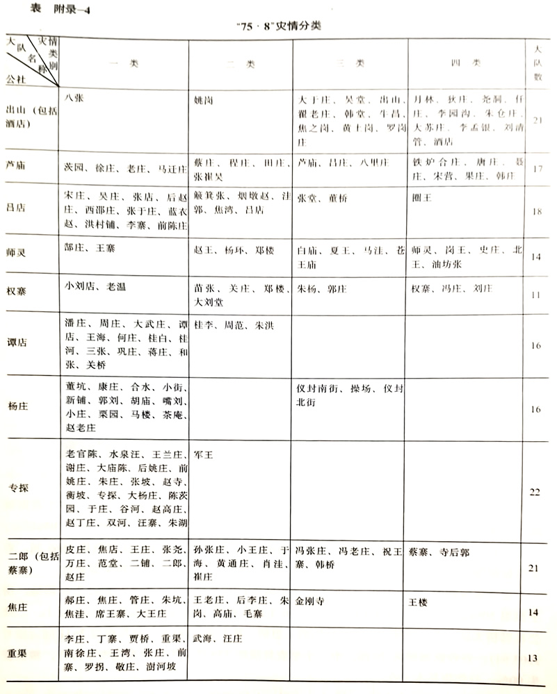 遭受毁灭性灾害的有160个大队,1679个生产小队,7.26万户,40.4万人,耕地65.2万亩。房屋倒塌殆尽,作物绝收,大牲畜和生产、生活资料损失90%以上。杨庄公社董坑大队位于已废杨庄水库内,洪水期间水深4米,死亡68人。全大队原有牲畜268头,死亡260头;原有房屋2616间,倒塌2593间;农业机械81部儿平全部损毁,社员生产、生活用具毁坏殆尽;秋作物1982亩全部绝收;水后发病1500人。师灵公社郜庄大队黄沟村,紧靠洪河北堤。洪河在此决口,水头高3米多,溺死9人,地面建筑物全部冲光,土层冲刷1米左右,一个石磙冲走300米,全村仅剩3棵柳树,当时称“三柳庄”。