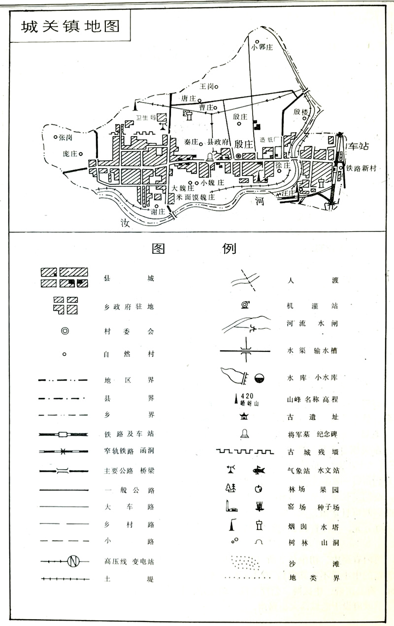 东西街与南北街垂直相交,供销社、经联社、乡政府、派出所、税务所、电影院、粮所在东西大街两侧,银行、信用社、手联社、生产门市部分布于南北大街两侧。