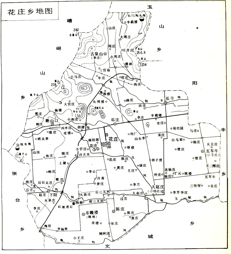 全境西高东低,有牛心山、棉子山、官山、二郎山等。河流有三叉河、赵庄河、长寺河,在境分别流长为5、6、4公里。修有大赵庄坝、杨楼坝、山岗坝、拐庄截流等工程。可蓄水2.7万立方米,灌溉面积6570亩。