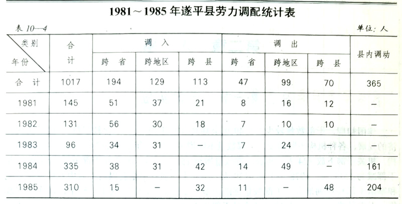 建国初期,县劳动工作由县工会代管。1957年按照中华人民共和国国务院颁布的《关于劳动调配工作中几个问题的通知》精神,进行劳动调配工作。1958年县成立人事劳动部,负责此项工作,1968年后由遂平县革命委员会内务组接管。1979年县劳动局成立,专设劳力计划调配股,负责全县劳力调配。调人职工不得超越上级批准的劳力计划和定员编制;不得把一线人员调往二、三线或从事非生产性活动,确保一线有足够的劳动力;集体所有制单位的职工,不得调人全民所有制单位;县外调动本着大城市就中、小城市,内地就边疆,一、二线地区就三线地区和一人就全家的精神。调配范围:夫妻长期分居实有困难者,独生子女或父母年迈多病身边无人照顾者,技术专业不对口,用非所学及情况特殊者等。1981到1985年全县共调配职工1017人。