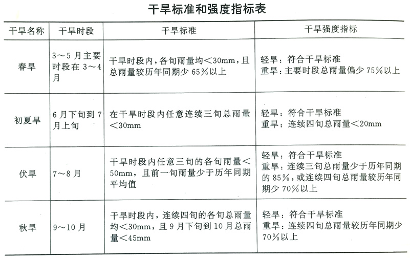 根据汝南县各种干旱资料和历年干旱调查、对照雨量记录,干旱标准和强度指标是:
