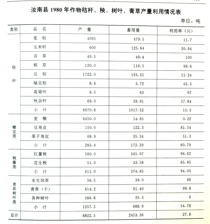 1955年,县试行玉米杆、红薯秧挖窑青贮,冬季取出喂牲畜。1960年青贮玉米杆达342万公斤。70年代以来,麦秸产量增多,饲草基本自足,青贮饲草已不多。1980年,饲草产量37867.5万公斤,家畜食用18932.15万公斤,食用率为49.9%。1985年总产42007万公斤,比1980年增长10.9%,其中,麦草、麦糠总产29358.5万公斤,比1980年增长41.4%。