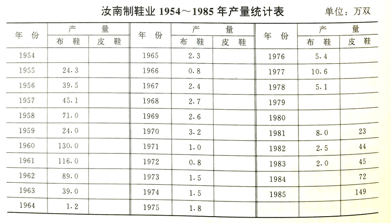 1955年,全县布鞋产量24.3万双,1960年最高年产量达到130万双。以后又逐年下降。1981年以后,在党的经济改革政策推动下,制鞋工业再次崛起,成为县一大产业。1981年到1985年,县新建鞋厂50余家,仅城关就有大小鞋厂47家,从业人员3500人。从事做鞋底,打鞋背,缝毛里等家庭副业的人员,总数5000余人。全县鞋厂,按人数拥有职工100人以上的有4家;按资产,企业全部资金在50万元以上的有5家;按产值,年实现100万元以上的有3家;按效益,年利税总额在4万元以上的有9家。1985年,全县制鞋业总产量149万双,总产值1596.7万元,占全县工业总产值的21.6%,居各工业门类之首。实现利税总额144.7万元,占全县工业企业实现利税总额的23.6%。1985年10月,《河南日报》载文誉汝南为“鞋城”。