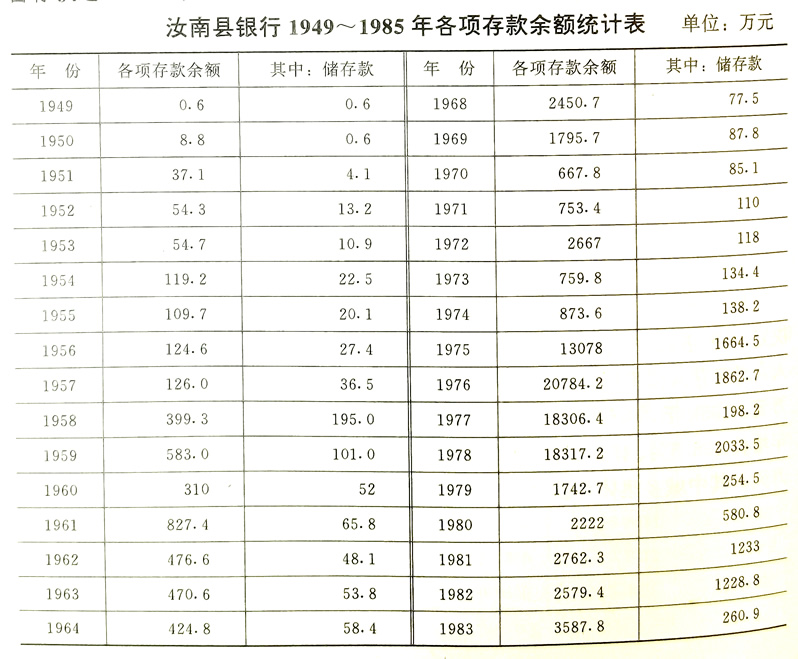 1950年4月,中央人民政府政务院,发布“关于实行国家机关现金管理的决定”,要求机关、团体、企事业单位对超过库存限额的现金,以及一切转账收入,均应存入国家银行。是年,全县单位存款8.8万元,其中城乡集体存款2.9万元。1952年,单位存款41.7万元,其中城乡集体存款17万元,分别比1950年增长408.5%、486.2%。随着国民经济的恢复发展,到1984年单位存款1668万元,其中城乡集体存款余额1040.7万元,1985年各项存款1972万元。