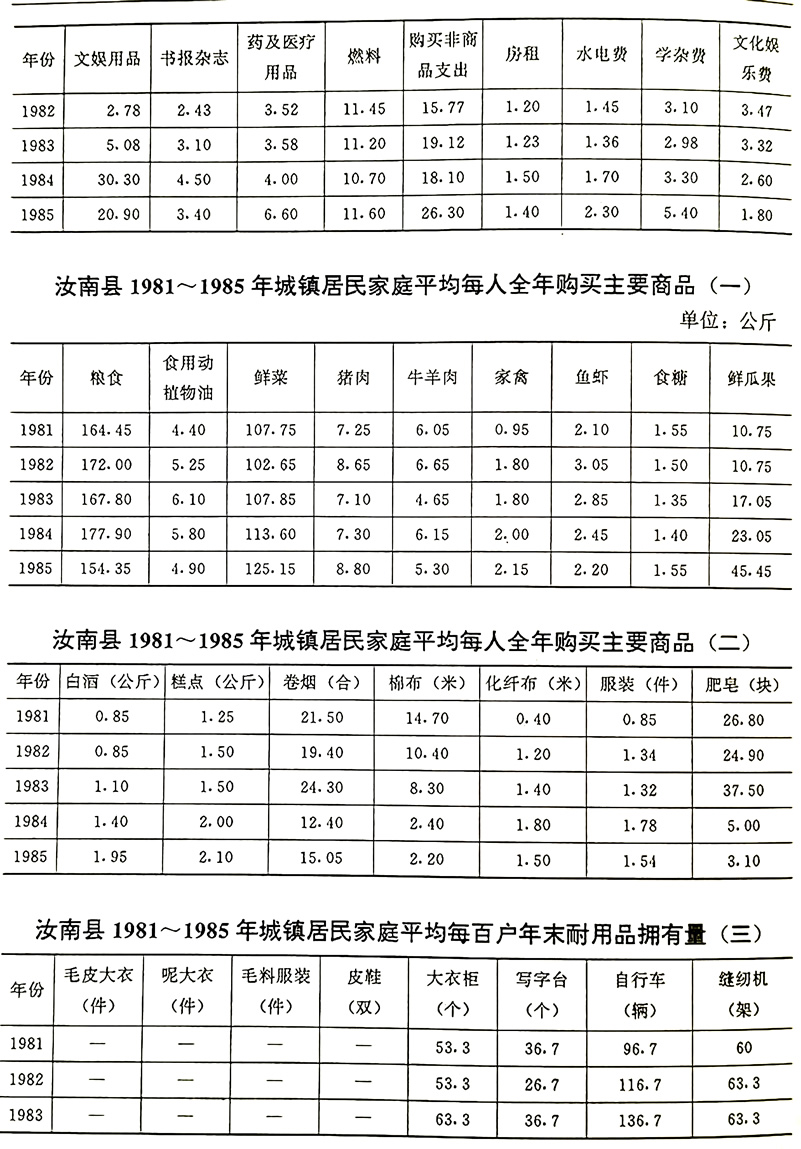 在用品上,“老四件”(自行车、缝纫机、手表、收音机)基本饱和。电视机、洗衣机、录音机、电冰箱、电风扇、照相机等耐用消费品开始进入城镇居民家庭。1985年人均用品支出38.4元,比1981年增长77.9%,年均增长19.5%。用品支出占生活费支出的比重也由1981年的8.1%,上升到1985年的9.4%。到1985年末,县城镇居民每百户拥有电视机40台(其中彩色电视机4台、黑白电视机36台)、电风扇76台,分别比1981年增加36.7台、66台,录音机、洗衣机、电冰箱百户拥有量已达24台、24台、4台。