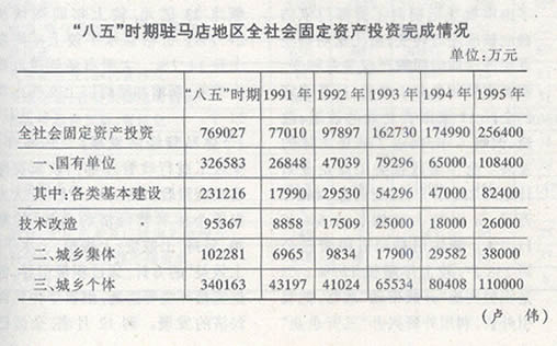 三、固定资产投资领域成效显著,重点项目进展顺利。1995年完成固定资产投资26.79亿元,比上年增长37.7%。其中,国有单位完成8.89亿元,比上年增长35.7%。本年初安排30个重点建设项目(其中:竣工、投产项目8个,续建及新开工在建项目10个,开展前期工作项目12个),18个竣工,在建重点项目本年度计划投资53200万元,止12月底,已完成投资42150万元,占年计划的79%。12个前期工作项目中,确山水泥厂二期扩建,地区热电厂2x2.5万千瓦供热机组扩建工程,汝南220千伏输变电工程,驻马店地区开元粮油实业集团有限公司花生综合加工厂等项目的初步设计已经上级主管部门下文批复,可望于翌年开工建设。确山水泥厂三期扩建,华中医药集团公司20吨/年天方罗欣,220吨/年泰乐菌素生产线,地区电表厂年产500万只多功能电子式电镀表和抄表系统项目,地区集中采浆中心及污水治理工程(遂平一纸厂),驻马店地区粮食(集团)公司大豆蛋白生产线等项目的可研、初步设汁已先后报国家计委及上级主管部门待批。