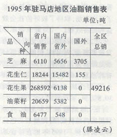 【油脂调销】 1995年全区油脂调销总量49216吨,其中芝麻省内销量6110吨,省外销量5656吨,国外销量3705吨;花生仁省内销量18244吨,省外销量15482吨,国外销量155吨;花生果省内销量268592吨,省外销量6138吨;油菜籽省内销量20659吨,省外销量5382吨;食用植物油省内销量6477吨,省外销量548吨。地区植物油集团公司调销总量为1938吨,其中芝麻110吨,花生仁1884吨,花生果455吨,菜籽油1000吨。本年度油料、油脂销价变动幅度不大,根据地区植物油集团公司实际销售情况,芝麻全年平均销价7.00元/公斤,豆油8.05元/公斤,菜油7.20元/公斤,花生果2.50元/公斤,花生仁4.26元/公斤,油菜籽2.66元/公斤。(滕凌云 翟建辉)