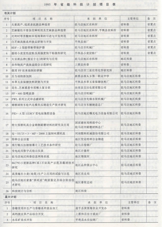 【科技成果管理】 1995年,地区科委制定下发《关于1995年驻马店地区科技成果鉴定、登记的通知》,提高了鉴定质量和管理水平,保证了科技成果鉴定工作的严肃性和科学性。推荐省级成果鉴定122项,完成了地级成果的登记、鉴定和评审工作。