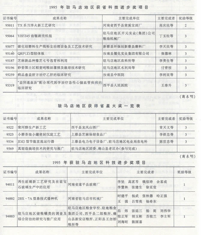 【科技成果获奖情况】 1995年,全区共获省科技进步奖8项,星火奖4项,地区奖励科技进步项目251项,其中一等奖29项,二等奖194项,三等奖28项。(商东明)