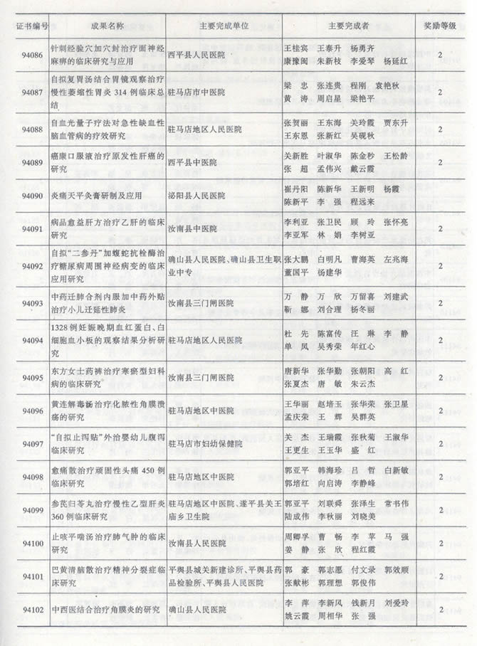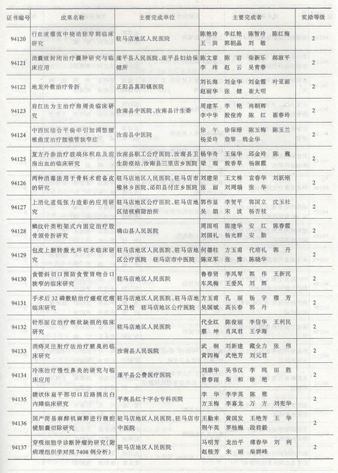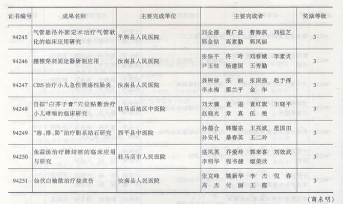【学术交流】 1995年全区举办学术研讨台48次,参加3700余人,交流论文476篇。通过征文评选,评出地级论文48篇。向省第四届自然科学优秀论文评委推荐19篇,向河南省首届青年学术年会推荐8篇,均已收入省优秀论文汇编。平舆郭楼骨伤科研所民间医生李奇今撰写的《接骨愈伤膏治疗骨与软组织损伤的临床研究》,获得联合国技术信息促进系统“发明创新科技之星奖”的奖牌,他撰写的《透骨止痛膏治疗颈腰痛320例临床报道》和《手法配服“安肾丸”辨证治疗腰痛225例》两项研究,在获得世界传统医学优秀成果奖之后,其论文在“1995年美国纽约国际中国传统医学学术会议”上,获得“中国传统医学杰出论文奖”的证书和奖杯。(徐翠英)