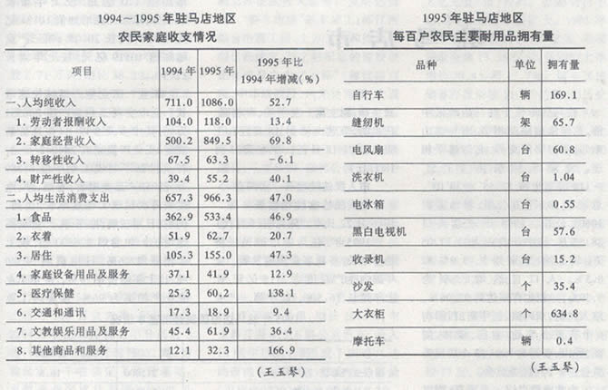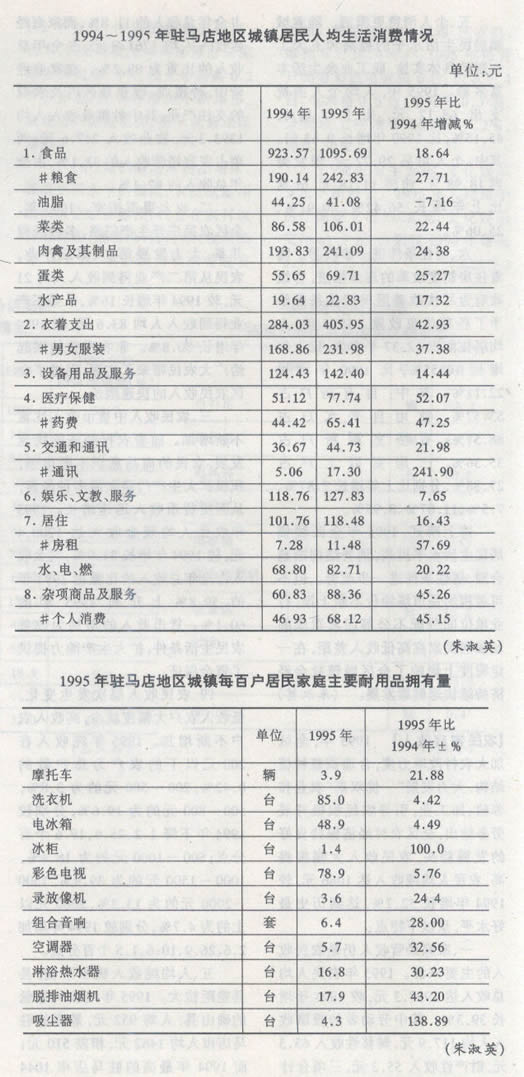 【农民生活消费】 1995年,驻马店地区农民生活水平显著提高,消费领域不断扩大,消费结构日趋合理,大部分农民实现了由贫困向温饱有余的转变,部分农民已率先达到小康水平。