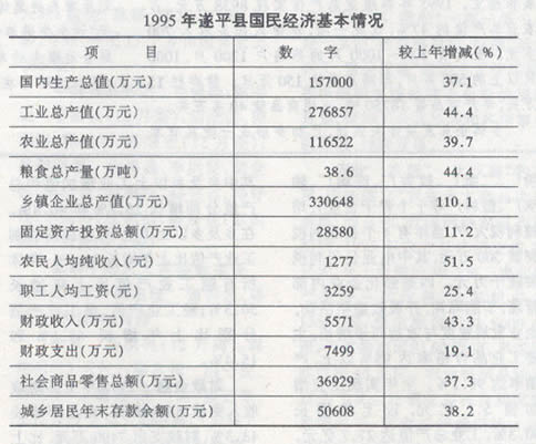 1995年,遂平县经济迅速发展,社会各项事业不断进步。当年完成国内生产总值15.7亿元,比上年增长37.1%,其中第三产业比上年增长20%;农业总产值比上年增长39.7%;全部工业总产值比上年增长44.4%,其中,乡以上工业产值增长40.8%,实现利税4981万元,增长46.6%;乡镇企业总产值比上年增长110.1%;财政收入比上年增长43.3%;农民人均纯收入比上年增长51.5%。