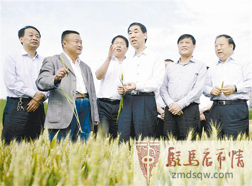 图为副省长王铁(中)在市委书记余学友(右二)的陪同下在西平县二郎乡万亩高标准粮田察看小麦生长情况。 记者 弓华静 摄